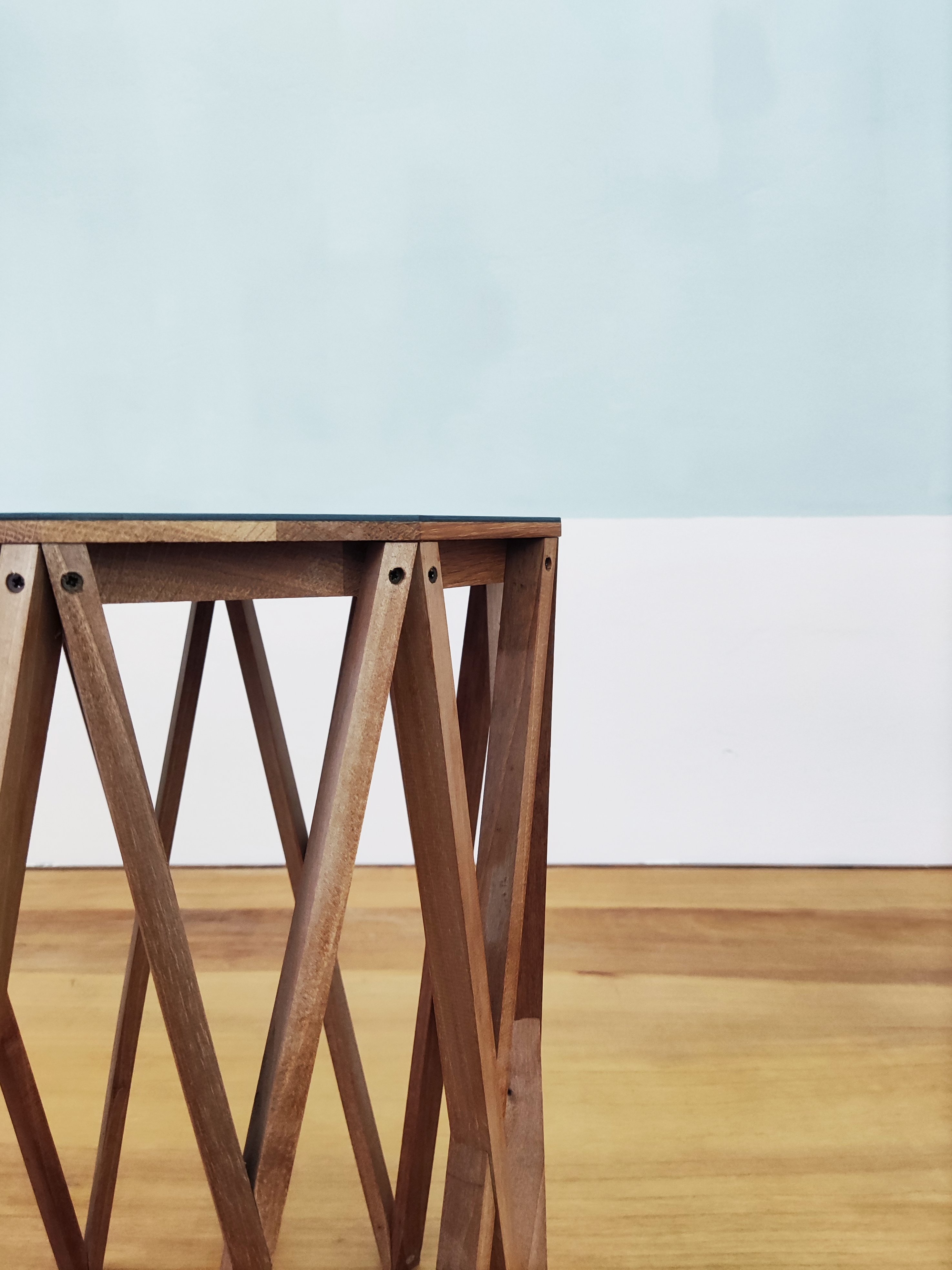 An oak decagon with linoleum skin supported by 20 interlocking walnut legs.